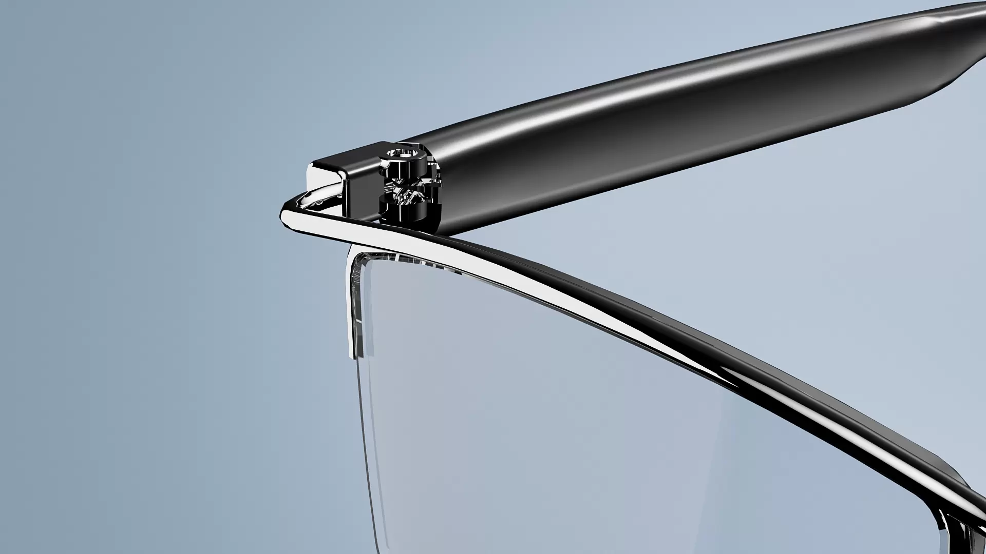 Shape and Lines: Shaping the aesthetic with geometric elements, the frame features a rectangular semi-rimless structure. The upper rim boasts straight, clean lines, while the corners feature subtle rounded transitions to avoid sharpness, striking a balance between boldness and softness to flatter the cheekbones and jawline. The temples feature a seamless, streamlined design that tapers gradually from the hinge toward the back, hugging the contour behind the ear. This ensures structural strength while minimizing visual bulk, making the frame appear lighter.