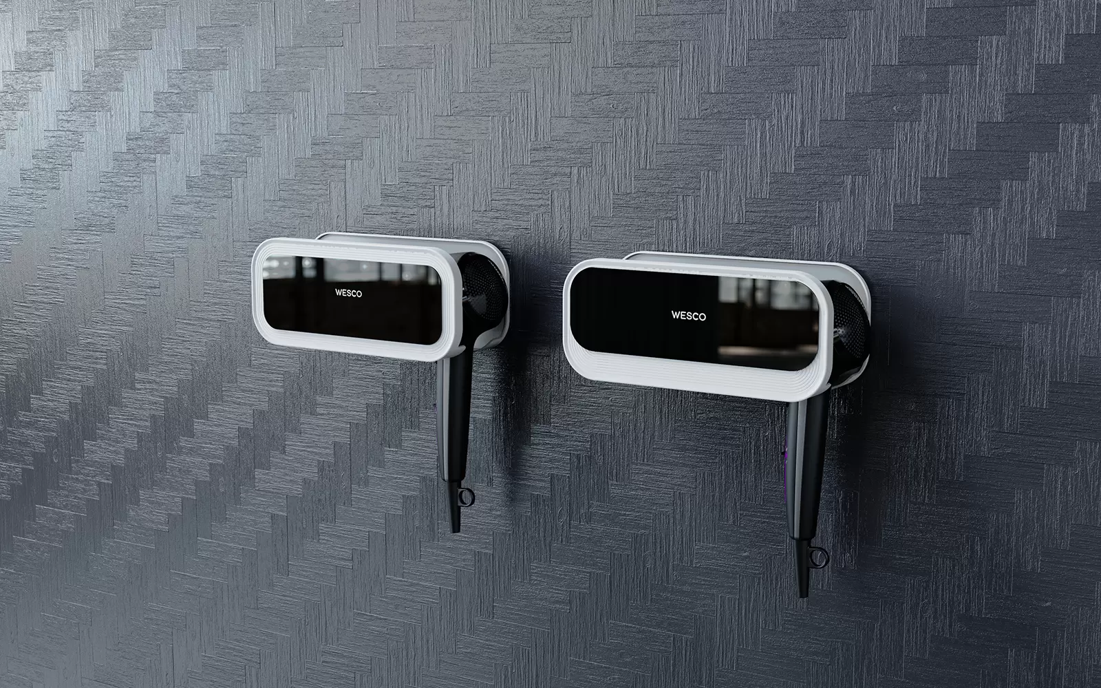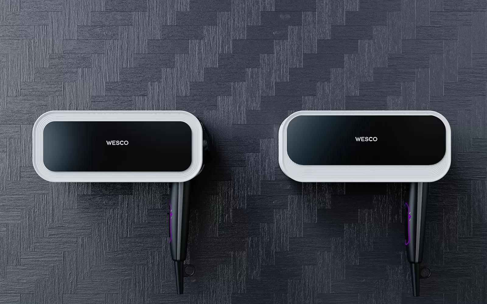 Simple geometric form (rounded rectangle), black and white contrasting color+floating design, seamlessly integrates with modern minimalist spaces such as minimalist bathrooms and internet famous hair salons. The "WESCO" brand logo is embedded in a black panel, which not only enhances recognition but also does not compromise the overall minimalist aesthetic, becoming a "decorative functional component" of the space.
