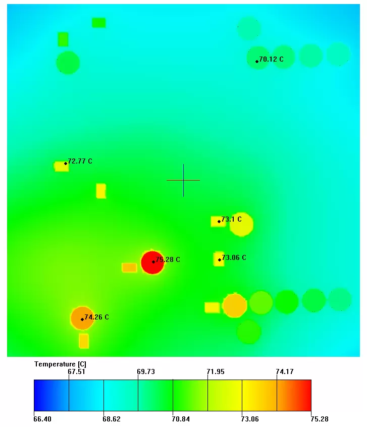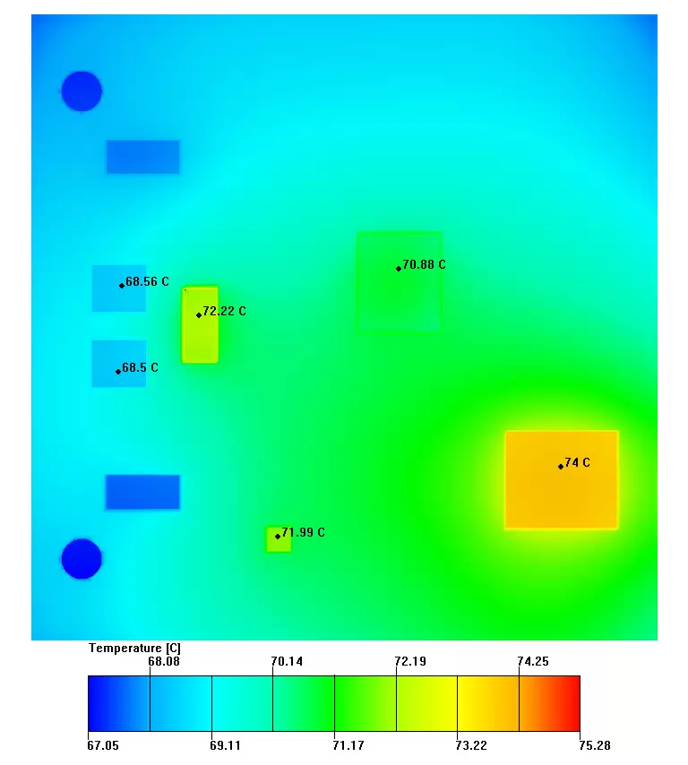 The maximum temperature of the radiator is 69.34 degrees at the connection point with the main control chip.